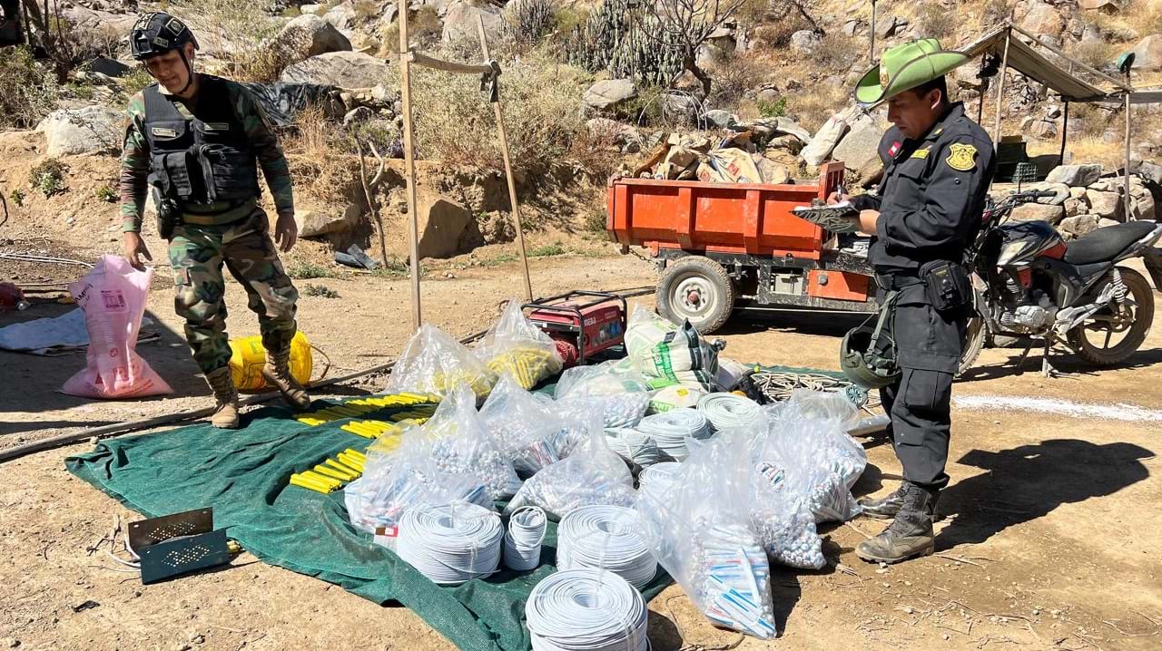 Los oficiales documentan los suministros y equipos mineros confiscados durante las redadas de la Operación Escudo Verde, catalogando activos por un valor de millones, utilizados en operaciones de extracción ilegal en la Amazonía.