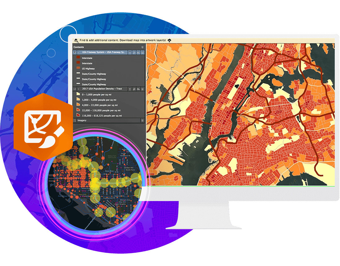 A menudo, los cartógrafos buscan mejorar sus productos de mapas creados mediante GIS con software gráfico como Adobe Illustrator. Para estos usuarios, el formato de exportación Adobe Illustrator Exchange (AIX) de ArcGIS Pro proporciona una vía fluida para convertir datos de mapa en imágenes gráficas para conseguir un diseño más artístico. ArcGIS Maps for Adobe Creative Cloud, un plug-in de ArcGIS para Illustrator de Esri, convierte datos ráster y vectoriales a partir de un archivo AIX en un archivo de Illustrator organizado y listo para diseñar. Este nuevo flujo de trabajo aporta a los diseñadores libertad creativa para mejorar el aspecto de sus mapas sin arriesgarse a modificar los datos almacenados en su GIS, lo que también la hace una herramienta de colaboración potente.