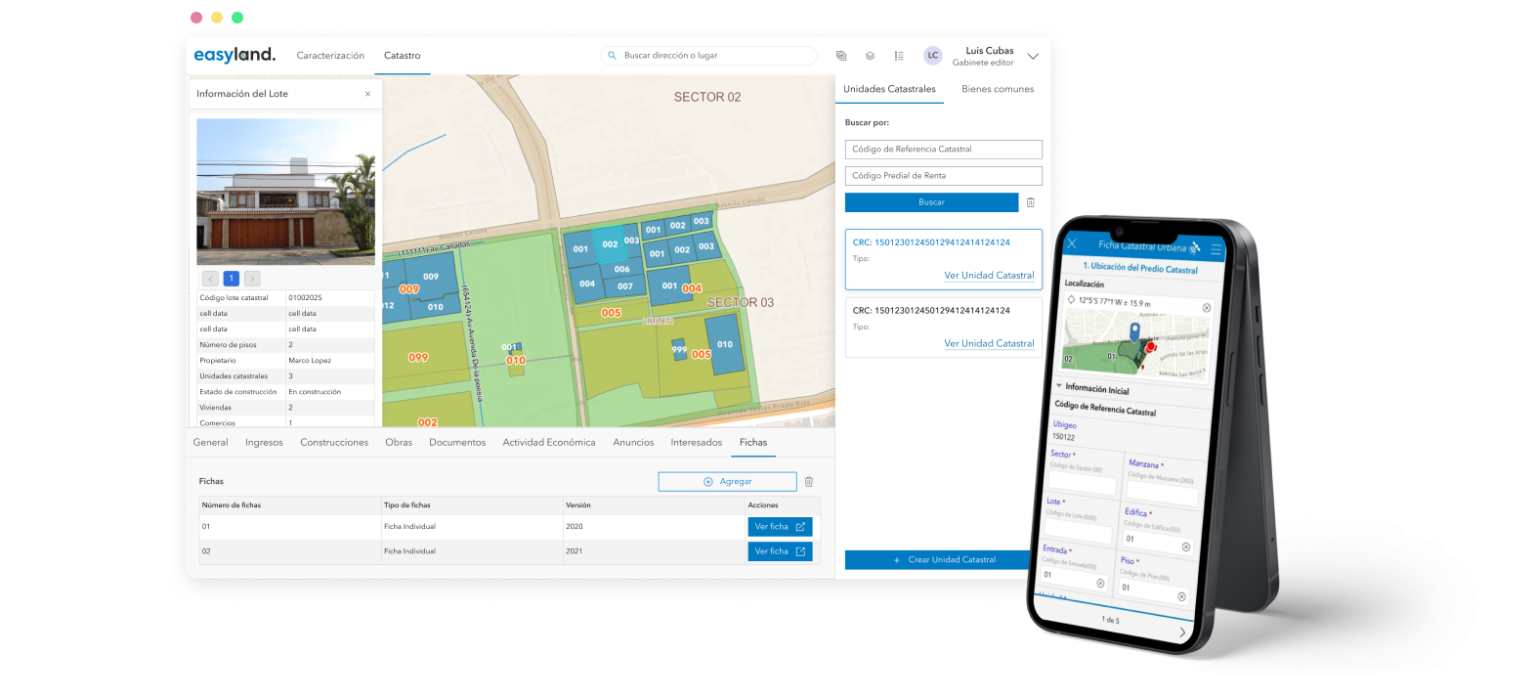 Construido con las capacidades de ArcGIS, easyland es un software que permite a los municipios conocer la realidad de sus distritos y tomar decisiones en base al catastro, estado del mobiliario urbano y detección continua de cambios sobre el territorio.