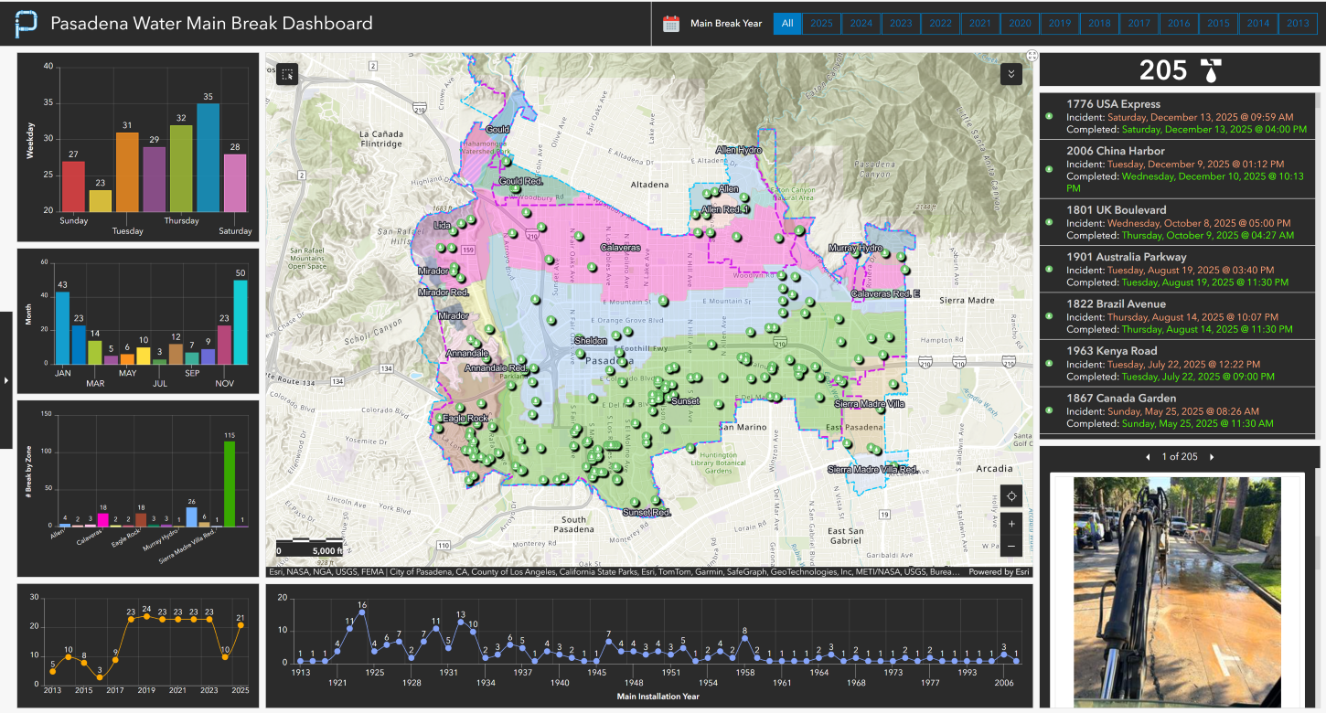 El centro ofrece información en tiempo real sobre proyectos clave de Pasadena Water, incluyendo análisis de roturas de tuberías principales, informes de calidad del agua, operaciones de descarga unidireccional (UDF), programas de conservación de agua con reembolsos de césped y una visión 3D de la gestión de activos. Gerentes, ingenieros y equipos de campo utilizan la plataforma GIS para compartir información, coordinar el trabajo y abordar los desafíos operativos.