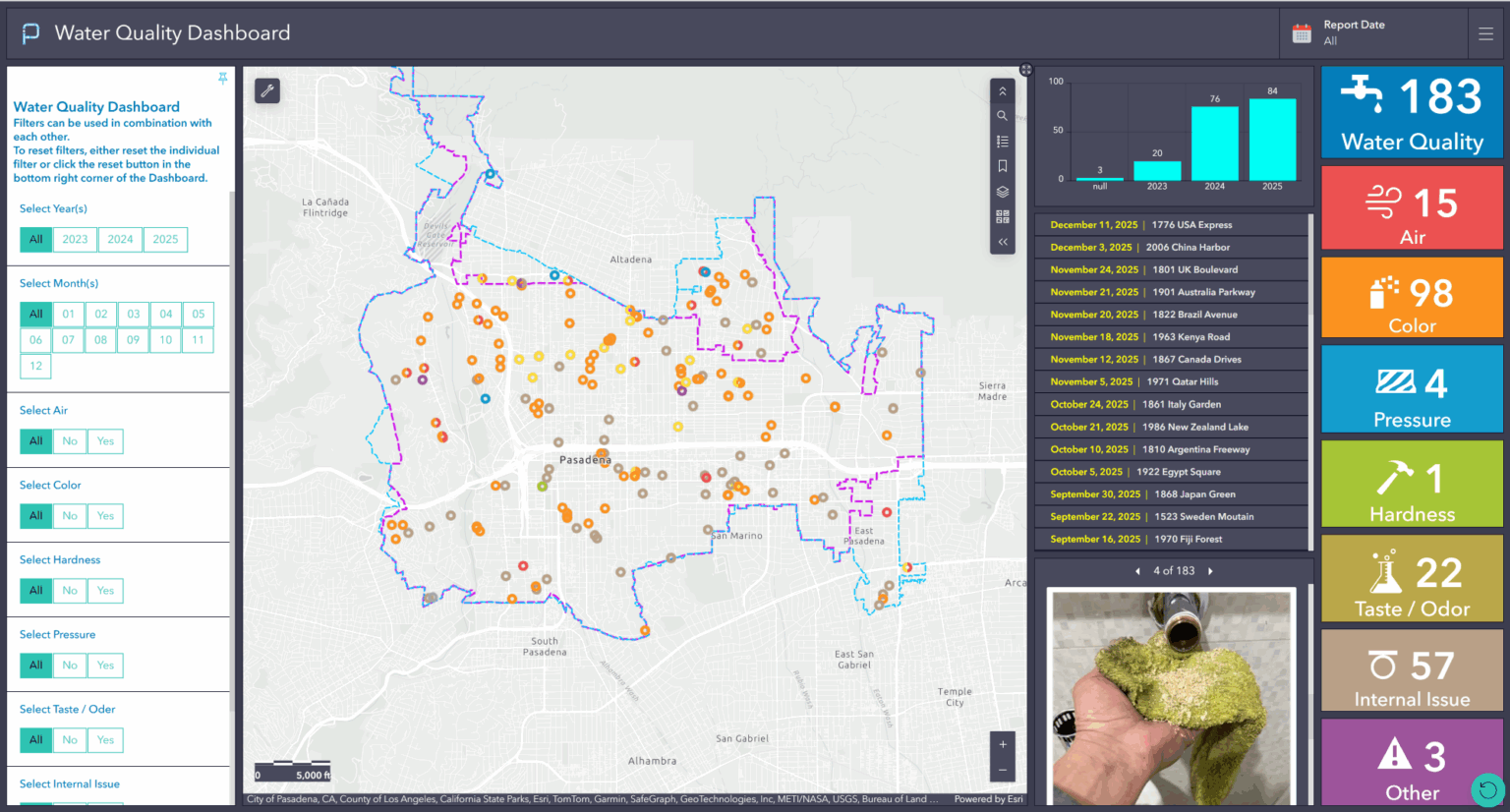 Anteriormente, las quejas sobre la calidad del agua se registraban manualmente en hojas de cálculo de Excel. En mayo de 2023, el equipo de calidad del agua solicitó una solución GIS para mapear, documentar y responder a las inquietudes de los clientes.