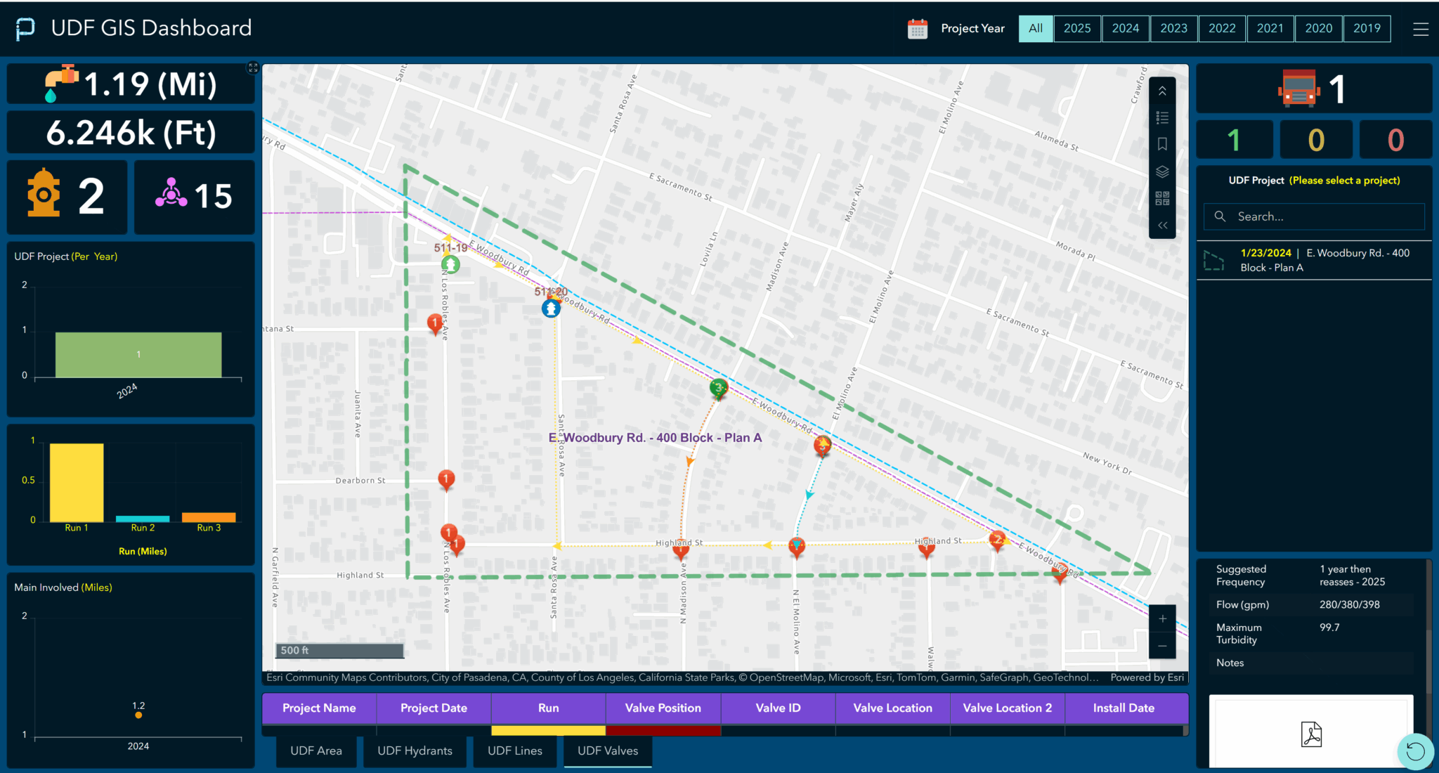 Cada proyecto de UDF se mapea, incluyendo el área de descarga, los hidrantes asociados, las tuberías y las válvulas que deben abrirse o cerrarse durante el proceso. Los equipos de campo ejecutan los planes mediante aplicaciones móviles, mientras que los ingenieros y supervisores monitorean el progreso mediante mapas en vivo, aplicaciones, tableros de control y herramientas de análisis.