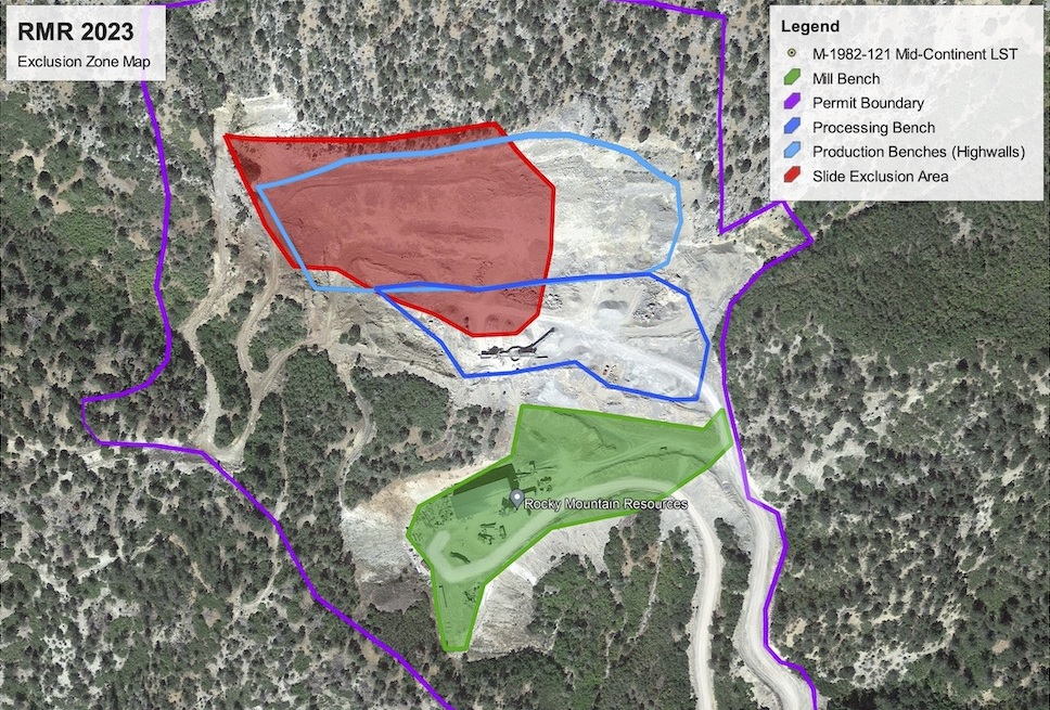 Mapa de la zona de exclusión posterior al deslizamiento de rocas preparado por la División de Recuperación, Minería y Seguridad de Colorado, EEUU, mayo de 2023