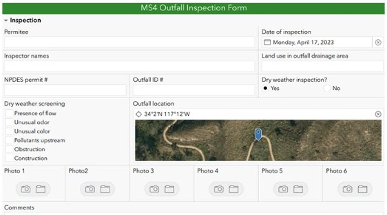 El formulario de inspección del emisario MS4 en la aplicación móvil Survey123. https://www.esri.com/en-us/lg/product/stories/pennsylvania-dep-case-study