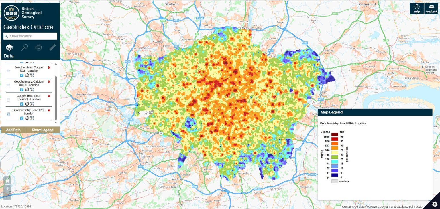 El visualizador BGS GeoIndex Onshore muestra mapas geoquímicos interactivos para cinco de estos elementos (cobre, calcio, hierro, plomo y níquel)