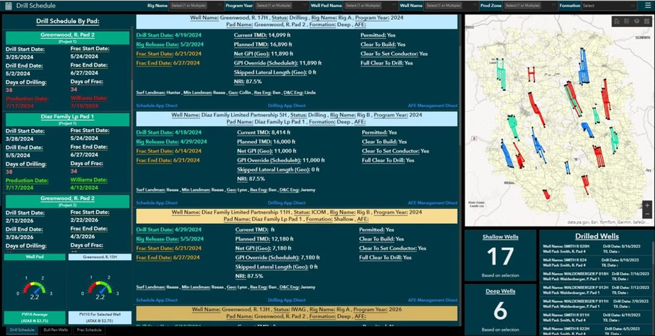 El tablero de control del cronograma de perforación de Coterra Energy integra fuentes de datos complejas en información clara y accesible para respaldar la toma de decisiones en tiempo real.