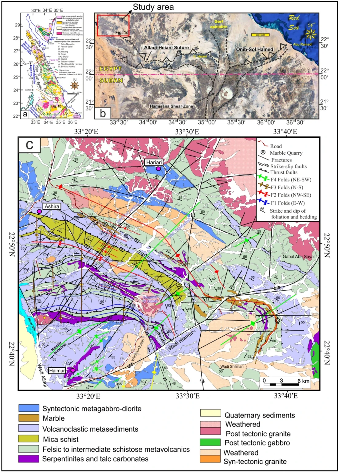 ( a ) Mapa geológico simplificado del desierto oriental de Egipto y el Sinaí que muestra la zona de falla de Najd y las principales estructuras en el escudo nubio egipcio (modificado de 13 , 14 , 15) ; ( b ) Imagen Landsat que muestra la ubicación de la sutura Allaqi-Heiani y el área de estudio ; y ( c ) Mapa geológico del cinturón de cizalladura de Allaqi occidental (según Abd El-Wahed et al. 16 y EGSMA, 17 ). Mapa creado por ArcGIS Desktop v 10.7.1. https://www.esri.com/en-us/arcgis/products/arcgis-desktop/overview . Procesamiento de imágenes realizado por el software ENVI v. 5.3.