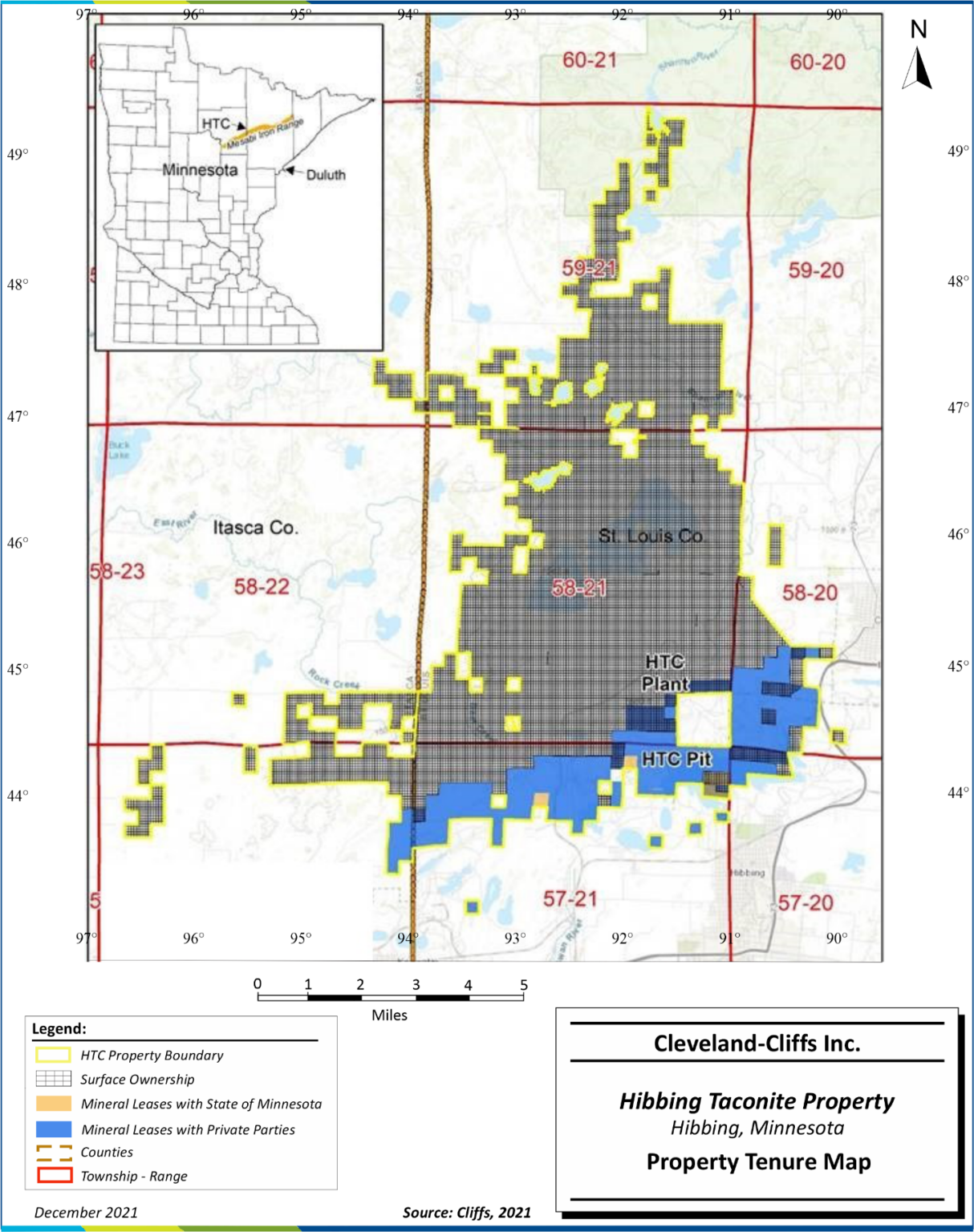 Mapa de tenencia de la propiedad Hibbing Taconite del resumen del informe técnico sobre la propiedad Hibbing Taconite, Minnesota, EE. UU. Informe SK 130