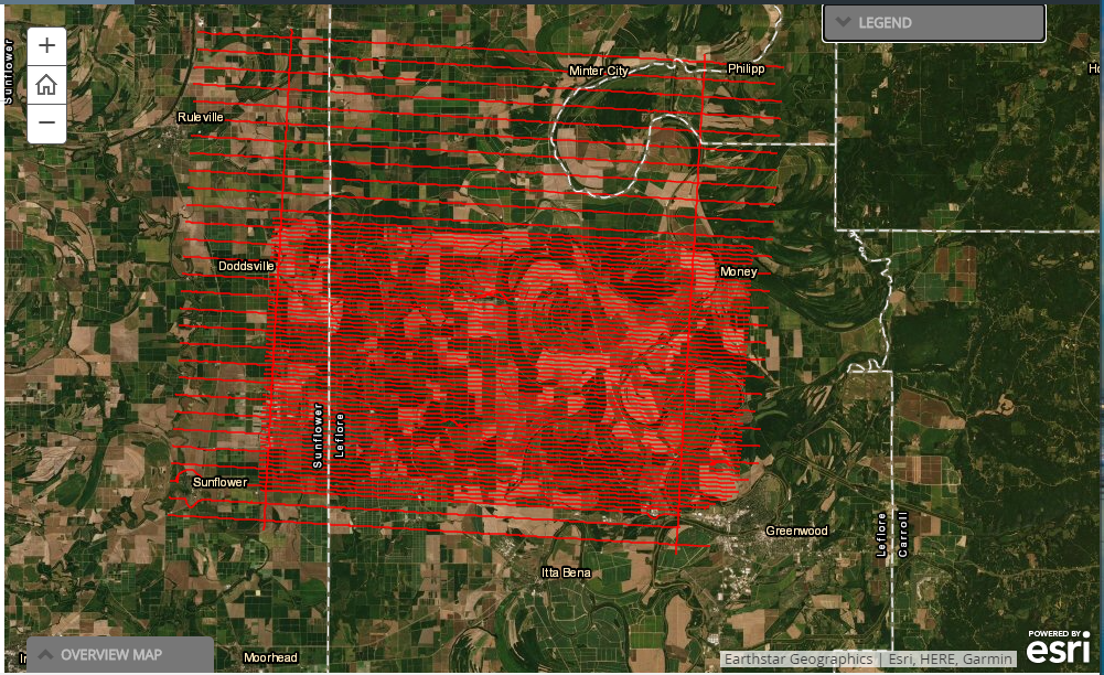 Captura de pantalla del mapa interactivo de la geonarrativa que muestra las ubicaciones donde se recopilaron datos geofísicos para el proyecto del Plan Aluvial de Mississippi del USGS. La geonarrativa, Llanura Aluvial de Mississippi: Shellmound, Estudio Geofísico de Mississippi, se encuentra en https://apps.usgs.gov/lmg/map/shellmound_SM.html .