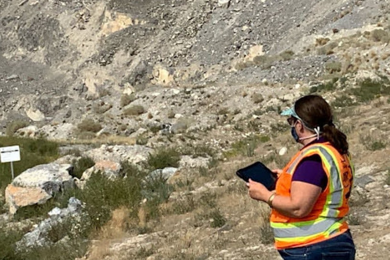 El inspector de la División de Petróleo, Gas y Minería del Departamento de Recursos Naturales de Utah (EEUU) con una tablet en una mina de piedra caliza llenando un informe de inspección en Survey123.