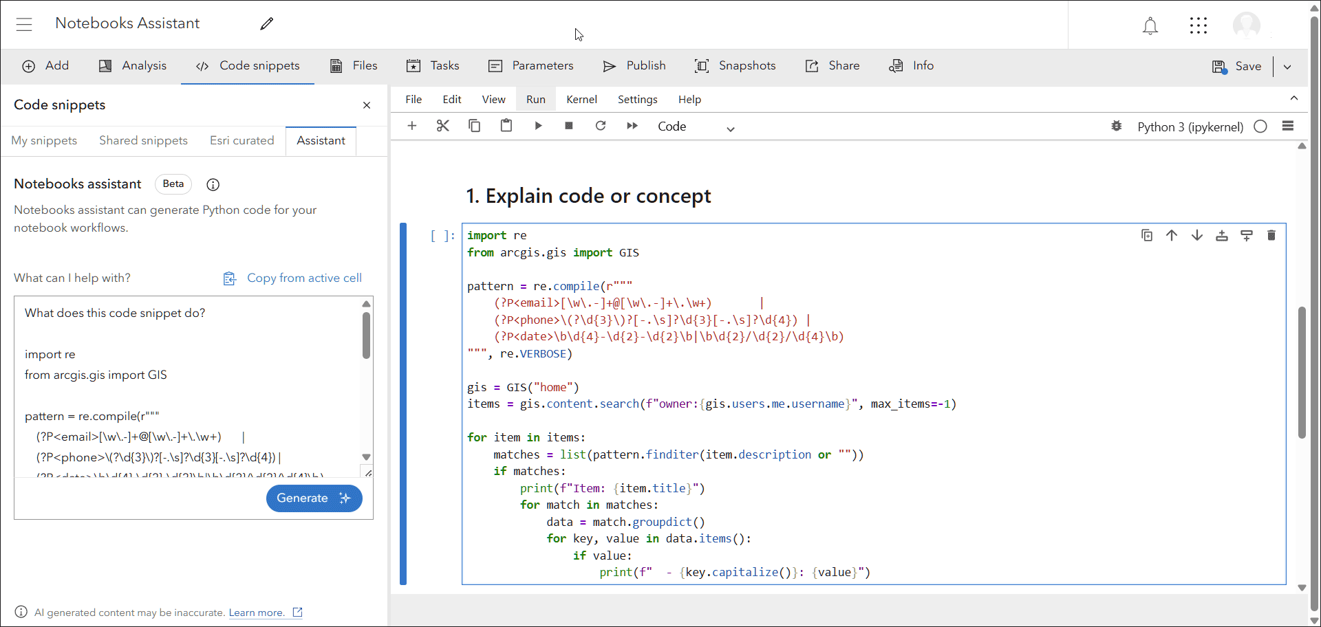 - Nuevo asistente IA para ArcGIS Notebooks (beta), disponible para ayudar a escribir, explicar y resolver código Python.