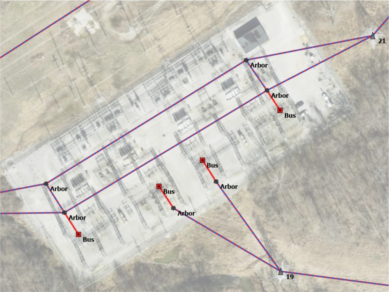 Modelo de datos no conectado en red (puntos y líneas); conductores y blindajes apilados; estructura de subestación sin equipos.