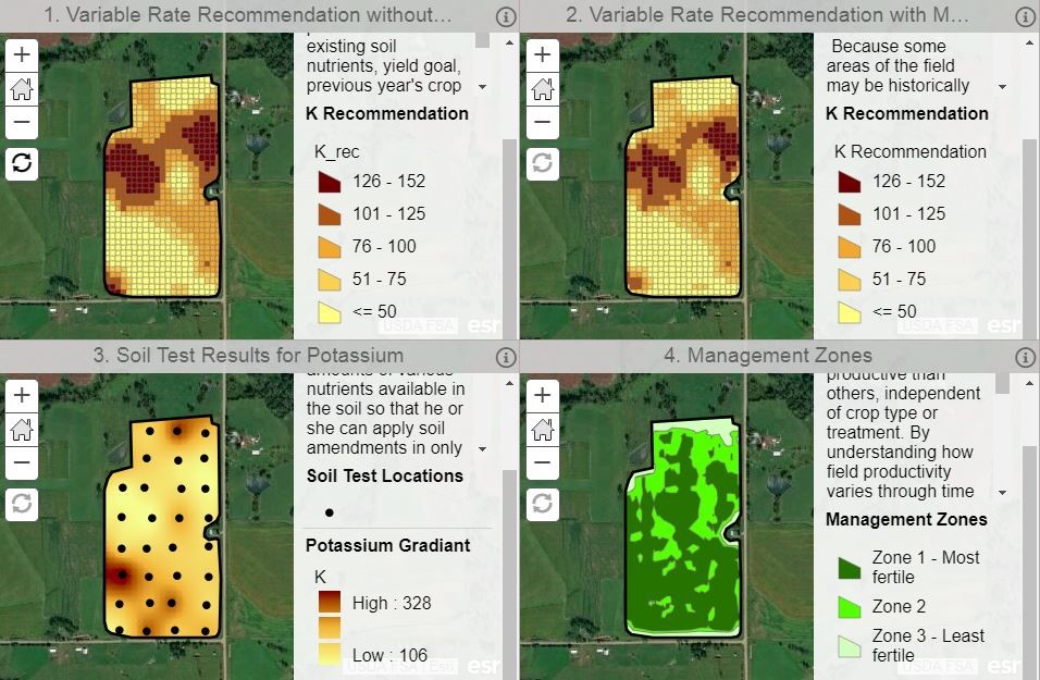 De igual forma se pueden hacer recomendaciones de tasa variable para una enmienda de suelo al combinar y analizar diferentes factores, como por ejemplo: los nutrientes presentes en el suelo de una determinada parcela, o datos de cultivos y rendimientos de años anteriores, los cuales serán cruzados con la información de zonas de gestión.
